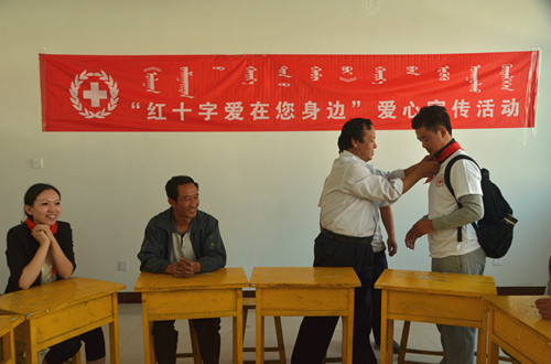 呼市蒙校學(xué)生為救援隊(duì)隊(duì)員們佩戴紅領(lǐng)巾