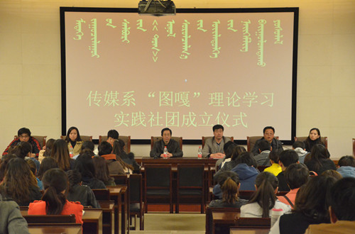 傳媒系舉行“圖嘎”理論學(xué)習(xí)實(shí)踐社團(tuán)成立儀式 2013年4月9日下午,在圖書館一樓報(bào)告廳舉行了傳媒系“圖嘎”理論學(xué)習(xí)實(shí)踐社團(tuán)成立儀式。會(huì)議由系黨總支副書記常喜主持,團(tuán)委書記阿古拉、社團(tuán)顧問馬列教研部主任額斯日格倉出席會(huì)議并作重要講話。團(tuán)委副書記海霞,團(tuán)委文體部王麗、郭晨也應(yīng)邀出席了會(huì)議,團(tuán)總支負(fù)責(zé)人齊丹宣讀了《傳媒系“圖嘎”理論學(xué)習(xí)實(shí)踐社團(tuán)章程》,社團(tuán)負(fù)責(zé)人白巖松同學(xué)代表全體成員發(fā)言。 傳媒系“圖嘎”理論學(xué)習(xí)實(shí)踐社團(tuán)是根據(jù)學(xué)院團(tuán)委進(jìn)一步加強(qiáng)大學(xué)生政治理論學(xué)習(xí)的要求,結(jié)合傳媒系學(xué)生對政治理論學(xué)習(xí)和實(shí)踐的實(shí)際需要,在學(xué)院團(tuán)委、系黨總支和馬列教研部的大力支持下成立的。社團(tuán)成員是由思想積極向上,熱愛理論研究,愿為他人服務(wù),自覺奉獻(xiàn)社會(huì),積極參加社會(huì)實(shí)踐的學(xué)生組成的,以學(xué)習(xí)和餞行中國特色社會(huì)主義理論為主要內(nèi)容的理論學(xué)習(xí)與實(shí)踐類學(xué)生社團(tuán)。社團(tuán)堅(jiān)持以學(xué)習(xí)科學(xué)理論、樹立正確的世界觀、人生觀、價(jià)值觀為宗旨;以提高學(xué)生政治素養(yǎng)為目的,開展理論宣講、社區(qū)服務(wù)、科技創(chuàng)新、社會(huì)實(shí)踐等符合當(dāng)代青年學(xué)生特點(diǎn)與時(shí)代要求的活動(dòng)。 學(xué)院團(tuán)委阿古拉書記致開幕詞。首先對社團(tuán)成立表示祝賀,同時(shí)總結(jié)回顧了傳媒系近幾年各社團(tuán)取得的主要成績,并對“圖嘎”理論學(xué)習(xí)實(shí)踐社團(tuán)的發(fā)展提出了幾點(diǎn)殷切希望。社團(tuán)顧問額斯日格倉主任則將大學(xué)生思想政治教育工作與該社團(tuán)的成立宗旨相結(jié)合進(jìn)行了深刻的闡述。 社團(tuán)負(fù)責(zé)人白巖松同學(xué)發(fā)言時(shí)表示:社團(tuán)的成立是為廣大青年學(xué)子提供了政治理論學(xué)習(xí)和實(shí)踐的平臺(tái),能夠切實(shí)提高學(xué)生黨員及入黨積極分子的政治理論綜合素養(yǎng)。希望各位同學(xué),能夠珍惜學(xué)習(xí)機(jī)會(huì),通過社團(tuán)有所受益。 最后與會(huì)全體師生觀看了黨的十八大精神學(xué)習(xí)專題片。
