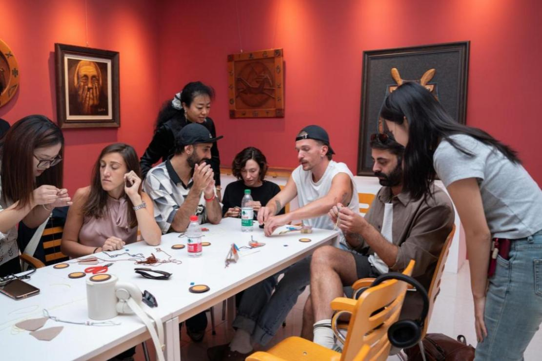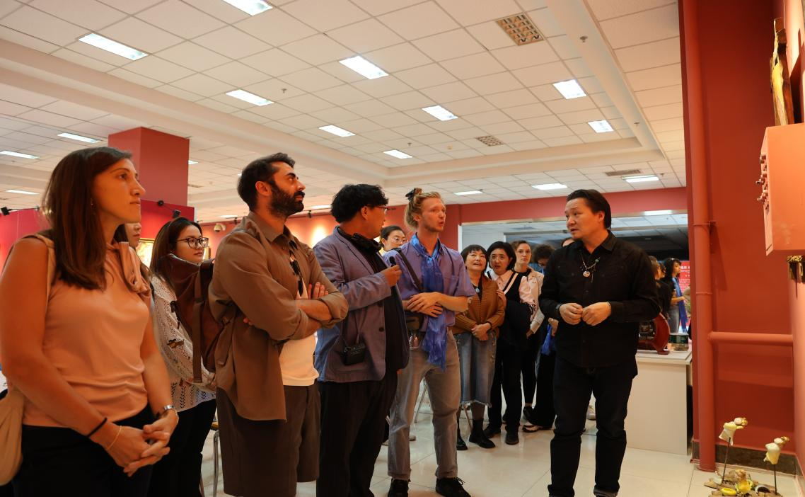 藝術(shù)交流之外,非遺文化體驗(yàn)與武術(shù)教學(xué)實(shí)踐讓交流維度進(jìn)一步拓展。在美術(shù)與設(shè)計(jì)學(xué)院教師木仁的帶領(lǐng)下,訪問(wèn)團(tuán)參觀了我校師生非遺美術(shù)作品展,并走進(jìn)自治區(qū)級(jí)“木仁創(chuàng)新工作室”,沉浸式體驗(yàn)毛氈、剪紙、皮畫(huà)等非遺手工藝品制作。這一過(guò)程不僅讓意大利師生感受了中國(guó)傳統(tǒng)非遺的藝術(shù)風(fēng)格與匠心精神,更成為我校美術(shù)與設(shè)計(jì)學(xué)科依托地域文化特色、開(kāi)展實(shí)踐教學(xué)與文化傳播的生動(dòng)展示。