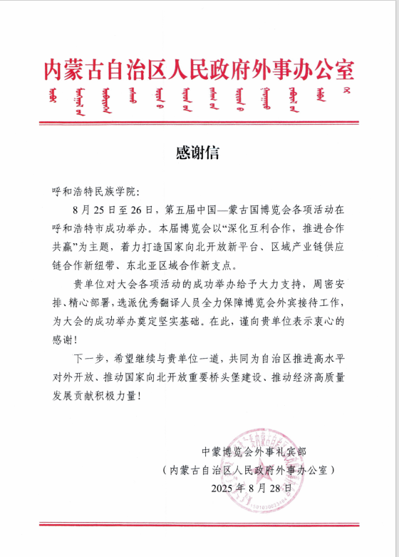 8月25日,第五屆中國—蒙古國博覽會在呼和浩特開幕,我校外國語學院教師包金蘭、商學院教師巴達拉夫在會議期間擔任翻譯,來自多個專業(yè)的60余名學生擔任志愿者,他們以扎實的專業(yè)能力、飽滿的服務熱情和嚴謹?shù)墓ぷ鲬B(tài)度,在多項重要活動中承擔志愿服務與會務支持工作,為推動中蒙交流合作貢獻力量。內(nèi)蒙古自治區(qū)人民政府外事辦公室中蒙博覽會外事禮賓部向我校發(fā)來感謝信,對我校志愿者在博覽會期間的突出貢獻予以高度認可。