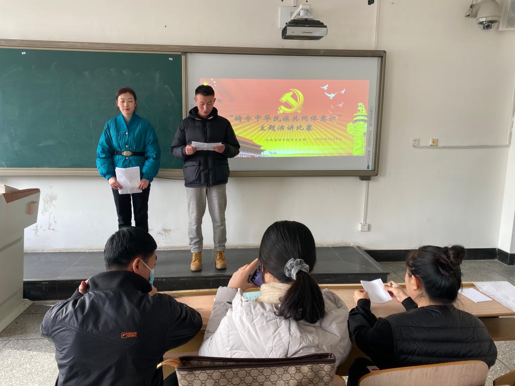 為進(jìn)一步激發(fā)廣大青年的愛國熱情,引導(dǎo)學(xué)生自覺維護(hù)民族團(tuán)結(jié),鑄牢中華民族共同體意識(shí),做好新時(shí)代民族團(tuán)結(jié)的“守護(hù)者”“傳承者”與“踐行者”,公共管理學(xué)院學(xué)生黨支部于2020年12月8日10:00,在尚智樓108教室舉行了“鑄牢中華民族共同體意識(shí)”主題演講比賽。參加本次活動(dòng)的評(píng)委老師有黨總支副書記額爾敦格日樂、學(xué)工辦副主任寶連和學(xué)生黨支部書記代陽老師等。