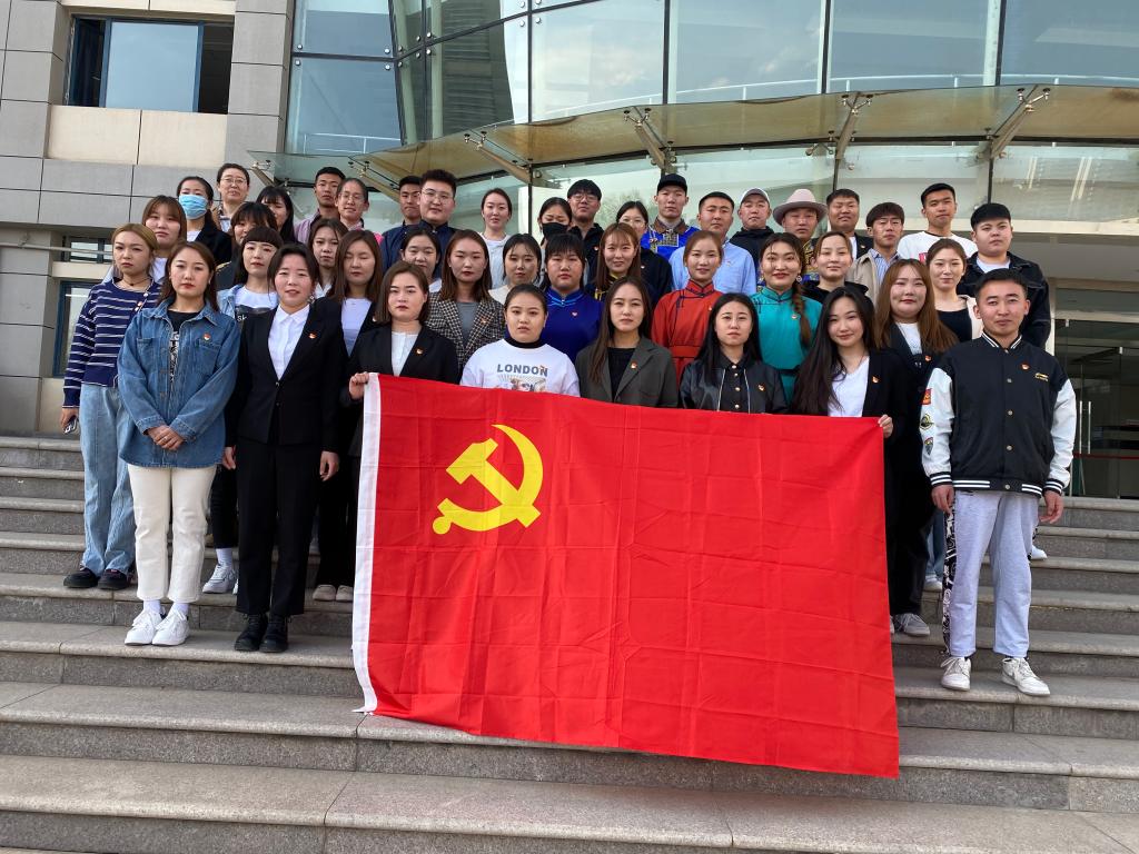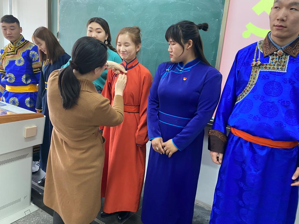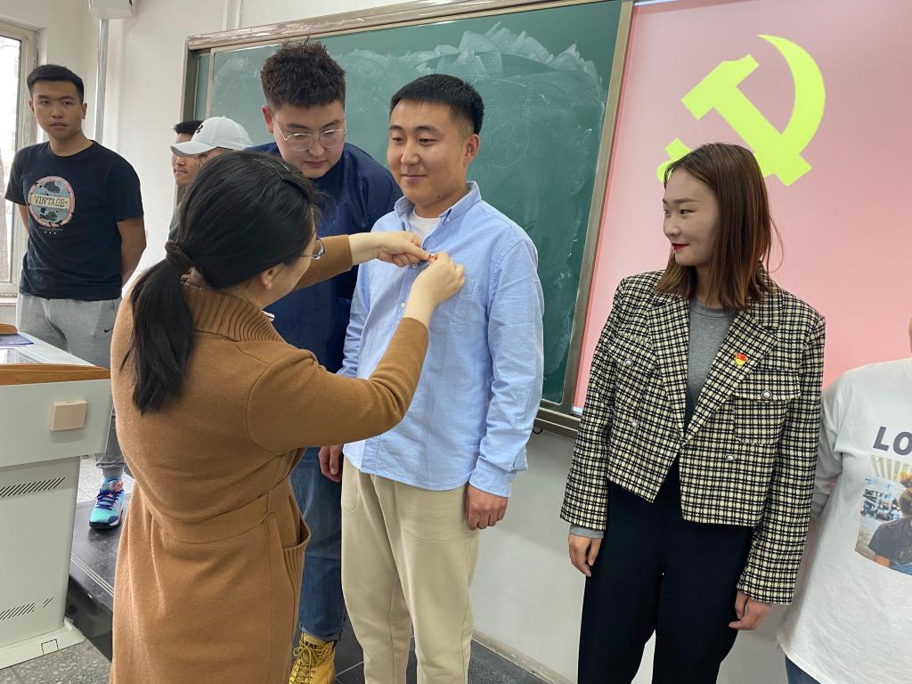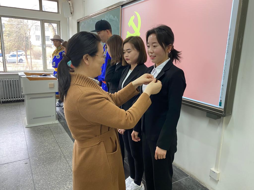活動中,黨總支副書記額爾敦格日勒為學生黨員親自發放并佩戴黨徽,介紹了《關于黨員佩戴黨員徽章》文件,向黨支部成員發出“戴黨徽亮身份、樹形象做表率”的倡議,要求學生黨員不斷提升服務學生的能力,自覺踐行“四個合格”,接受群眾監督,用實際行動發揮黨員先鋒模范帶頭作用。