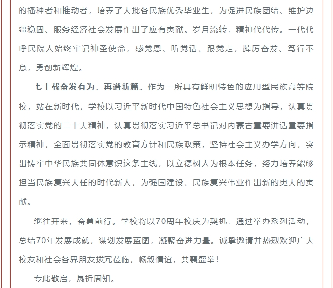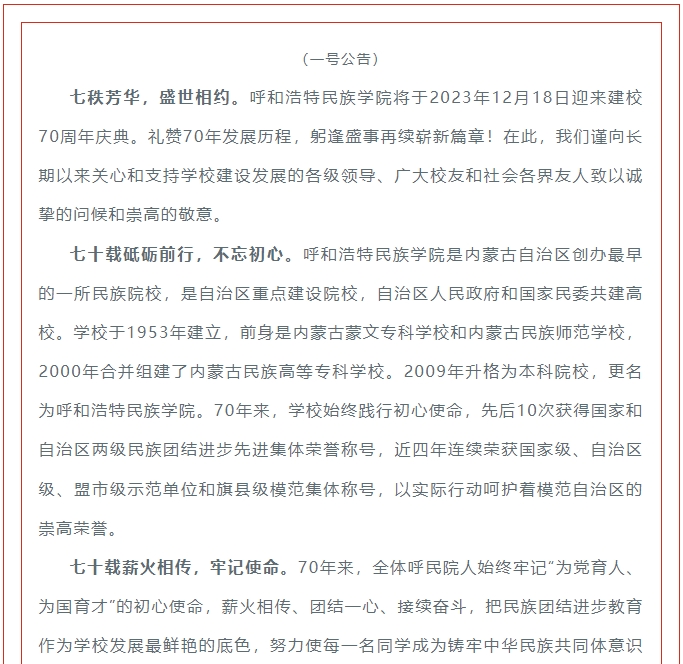 呼和浩特民族學院70周年校慶公告