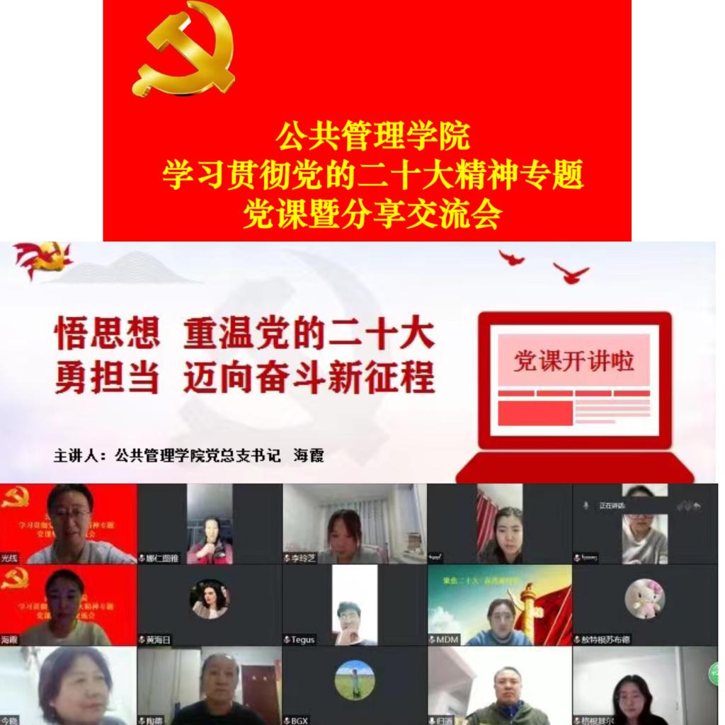 為深入學習貫徹黨的二十大精神,12月16日,公共管理學院黨總支開展了學習貫徹黨的二十大精神專題黨課暨交流分享會。全院教師和學生黨員參加了會議。
