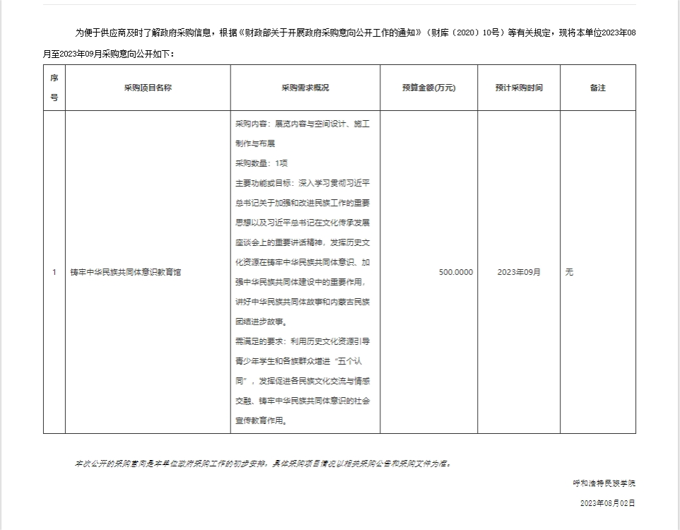 呼和浩特民族學院2023年09月政府采購意向