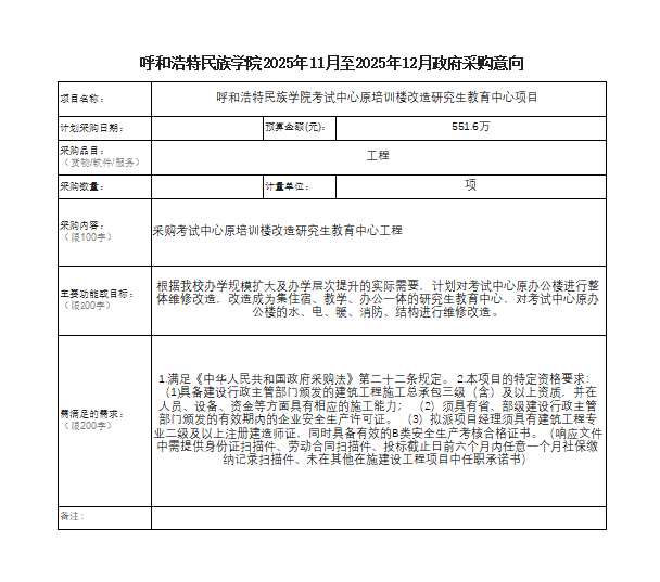 呼和浩特民族學院2025年11月至2025年12月政府采購意向
