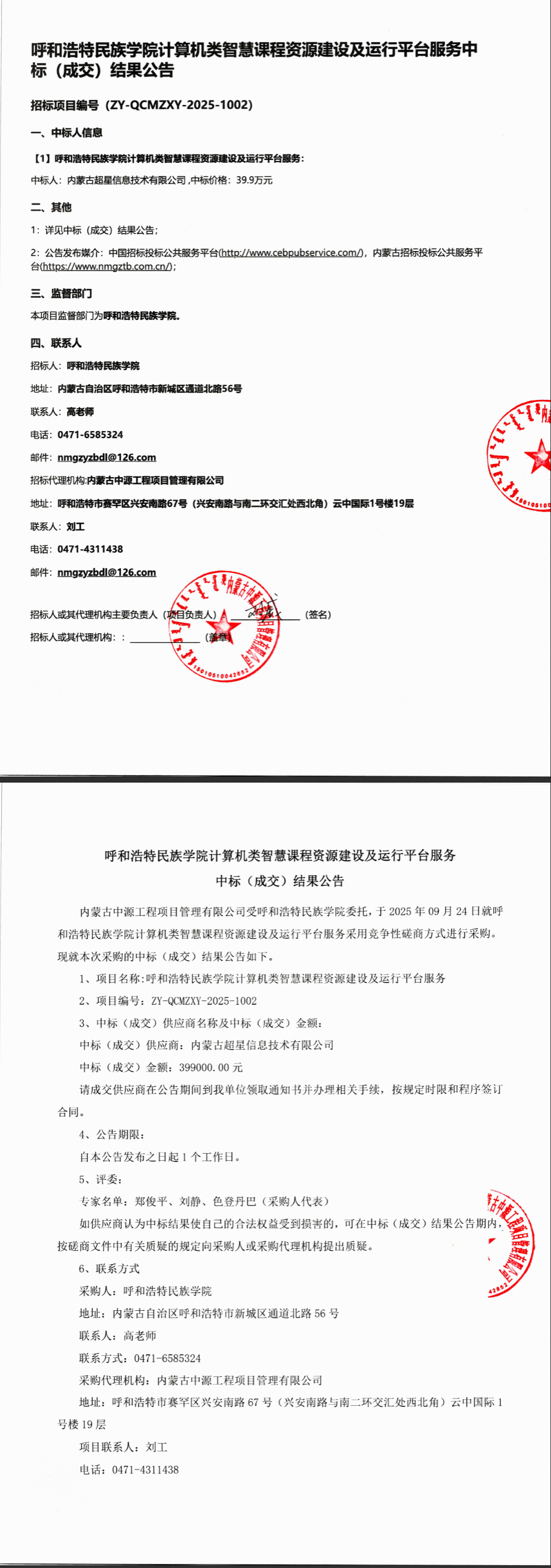 呼和浩特民族學(xué)院計(jì)算機(jī)類(lèi)智慧課程資源建設(shè)及運(yùn)行平臺(tái)服務(wù)中標(biāo)結(jié)果公示