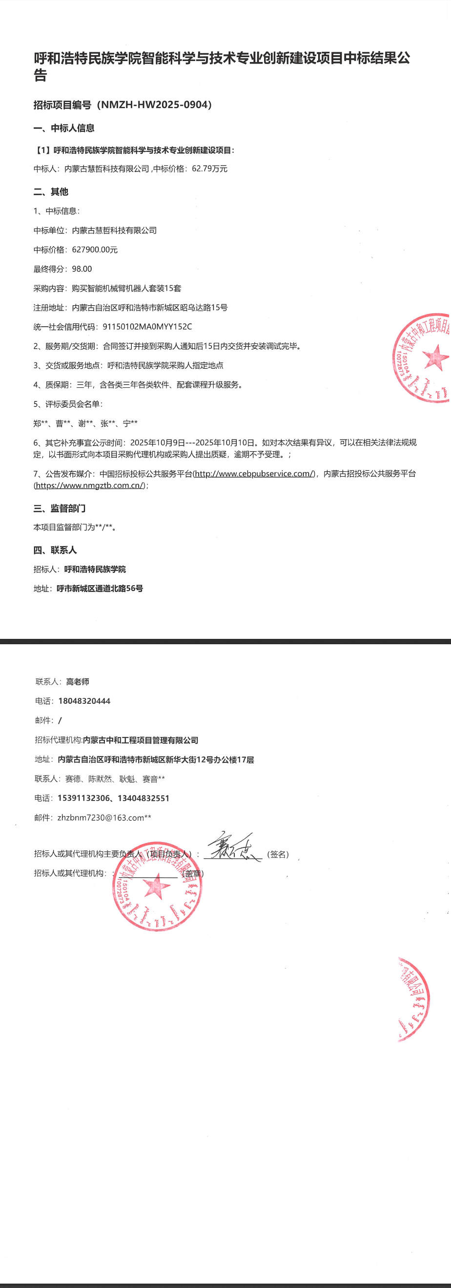呼和浩特民族學(xué)院智能科學(xué)與技術(shù)專(zhuān)業(yè)創(chuàng)新建設(shè)項(xiàng)目中標(biāo)結(jié)果公告