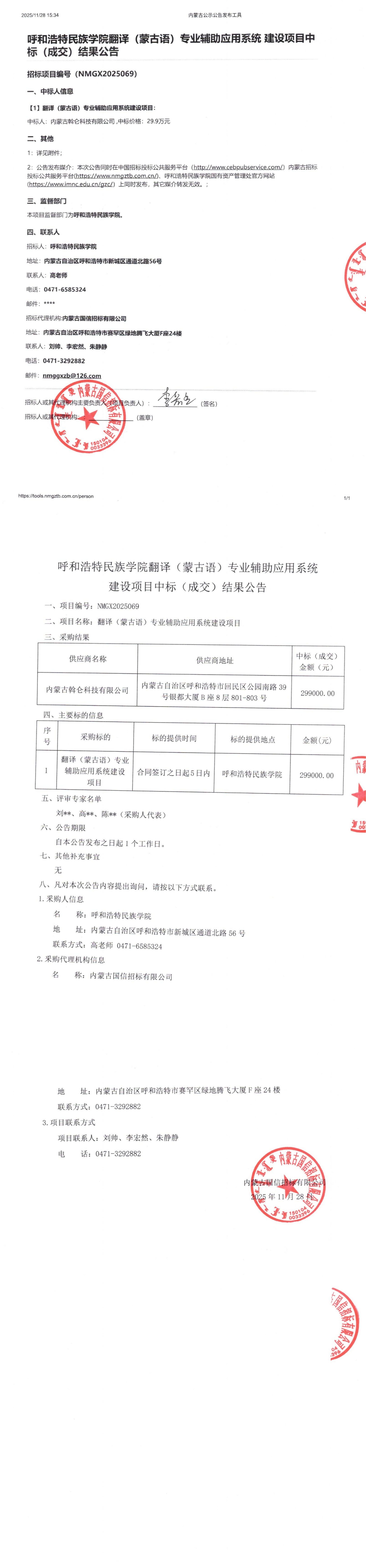 呼和浩特民族學(xué)院翻譯(蒙古語)專業(yè)輔助應(yīng)用系統(tǒng)建設(shè)項(xiàng)目中標(biāo)(成交)結(jié)果公告