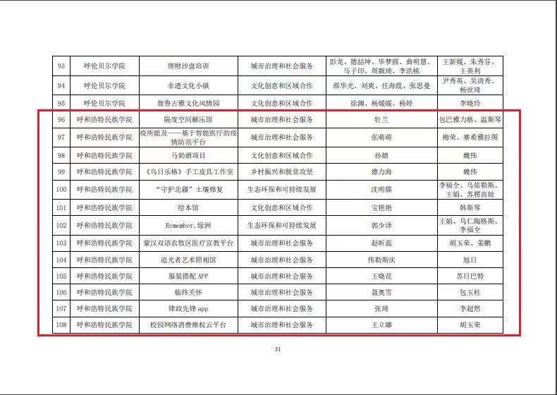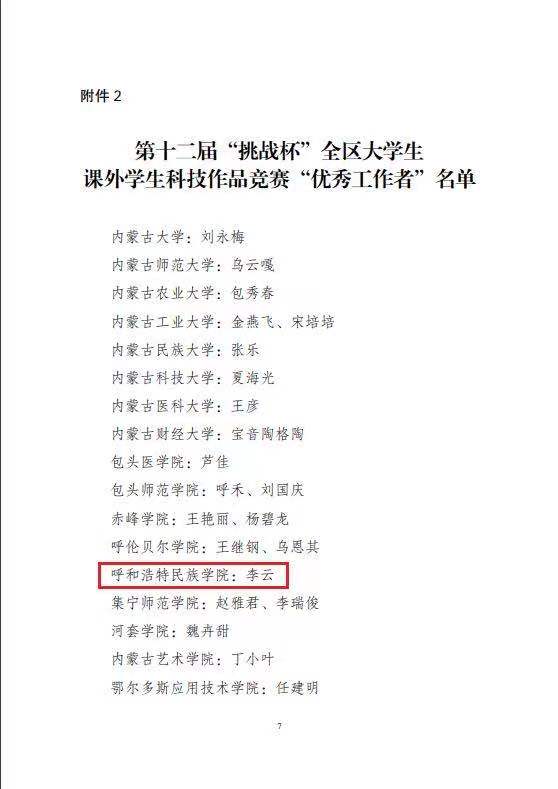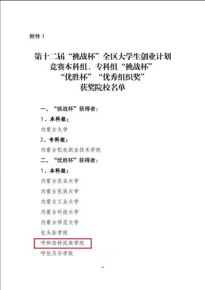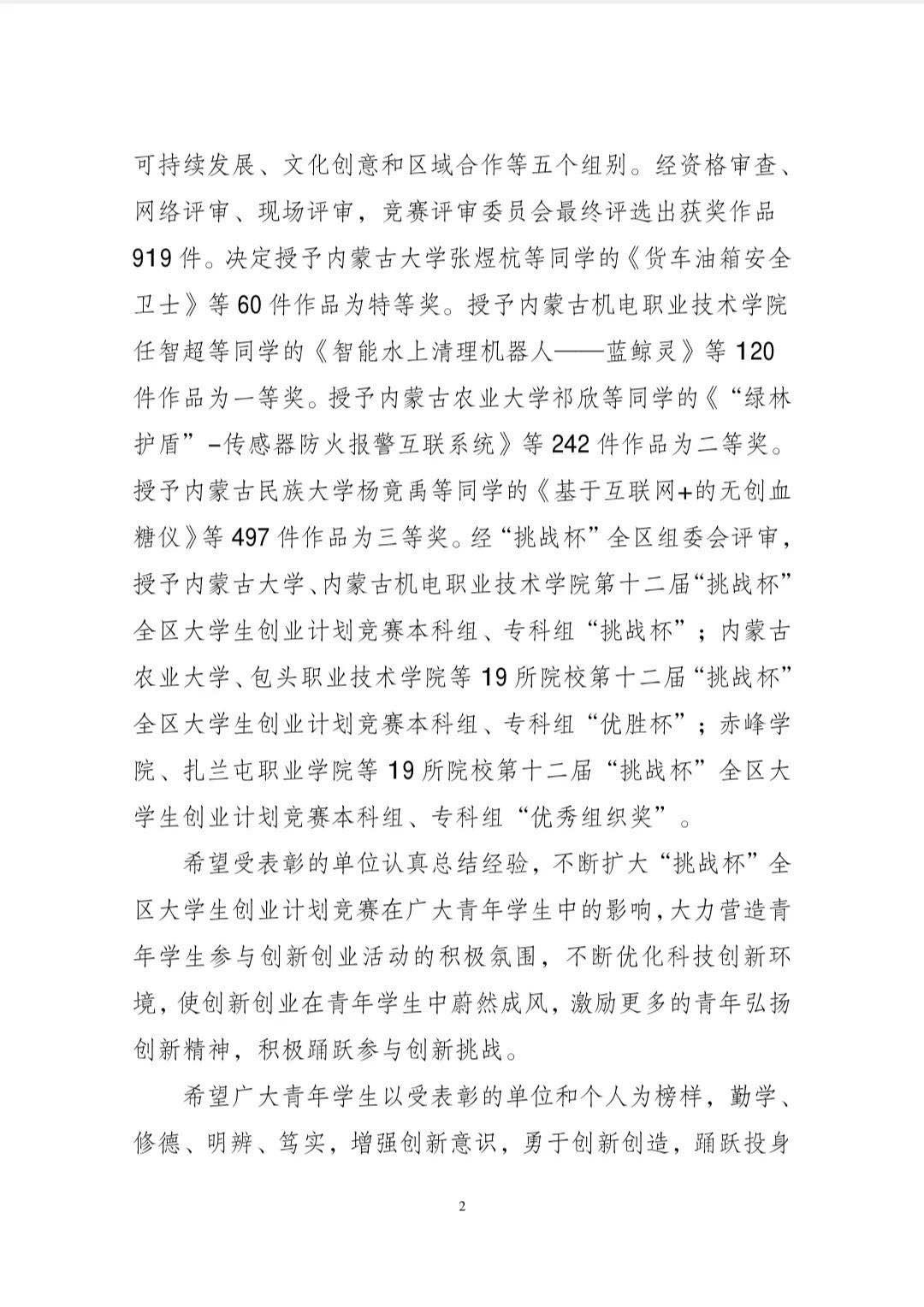 12月18日,共青團內蒙古自治區委員會、內蒙古自治區教育廳、內蒙古自治區科學技術協會和內蒙古自治區學生聯合會發布關于表彰十二屆“挑戰杯”全區大學生創業計劃競賽獲獎者的決定。