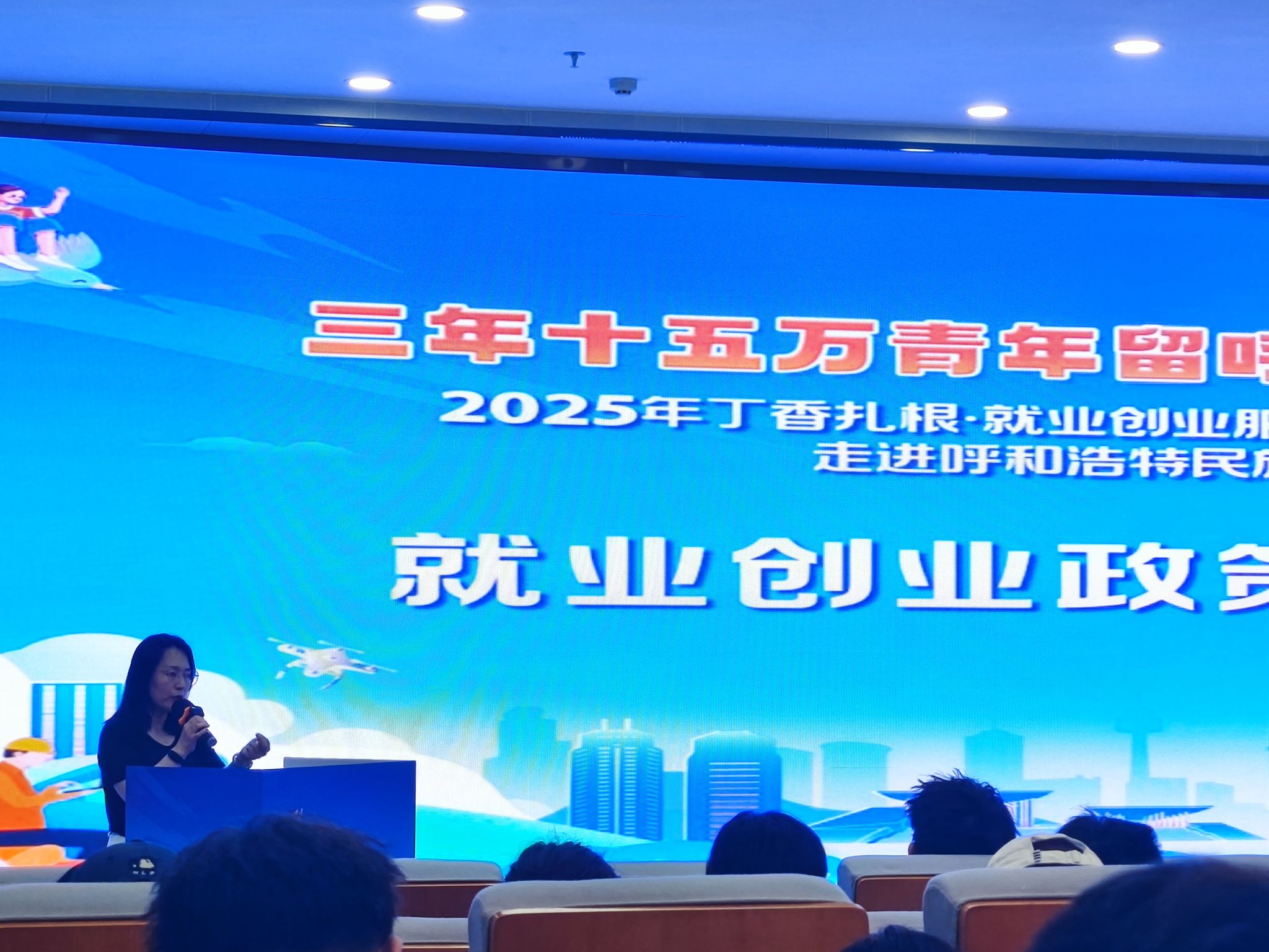 招聘會前,學校在北區圖書館1樓報告廳舉辦了政策宣講會,呼市人社局就業促進科相關人員圍繞城市環境、產業結構、人才政策、生活保障等方面進行詳細介紹,并為畢業生提供了現場答疑服務。
