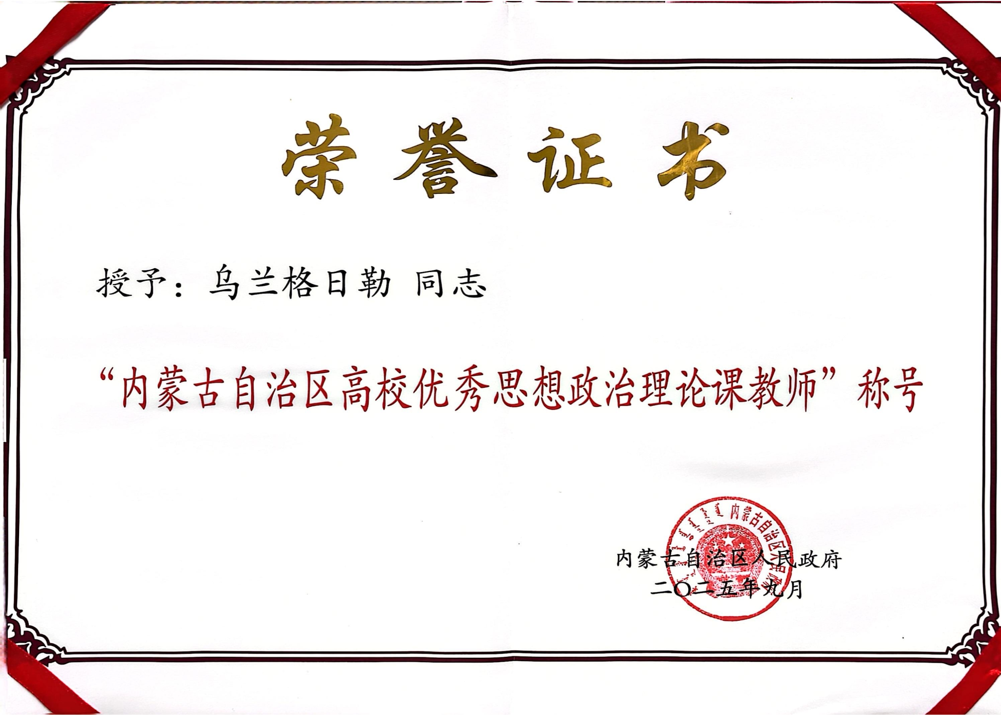 時(shí)逢第41個(gè)教師節(jié),內(nèi)蒙古自治區(qū)人民政府表彰了2025年全區(qū)教育系統(tǒng)先進(jìn)集體和先進(jìn)個(gè)人,我校馬克思主義學(xué)院烏蘭格日勒老師獲評“內(nèi)蒙古自治區(qū)高校優(yōu)秀思想政治理論課教師”榮譽(yù)稱號