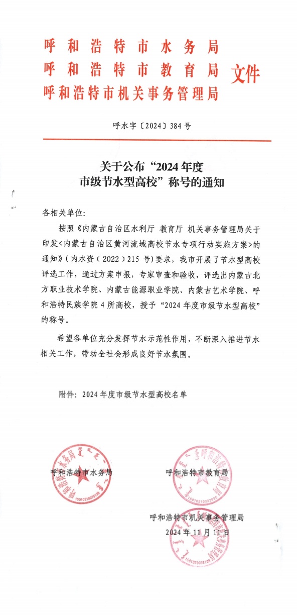 我校嚴(yán)格按照《內(nèi)蒙古自治區(qū)黃河流域高校節(jié)水專項(xiàng)行動(dòng)實(shí)施方案》(內(nèi)水資〔2022〕215號)要求,全面啟動(dòng)節(jié)水型高校申報(bào)工作。學(xué)校通過升級改造老舊供水管網(wǎng)、安裝智能水表實(shí)時(shí)監(jiān)控等舉措,經(jīng)過方案申報(bào)、專家審查和驗(yàn)收等層層考核,憑借扎實(shí)的工作成效成功入選“2024年度市級節(jié)水型高校”名單。