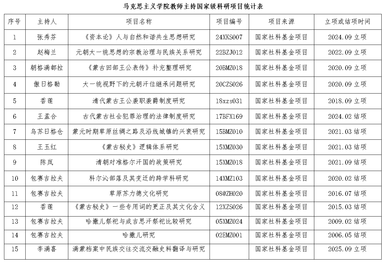 目前,學(xué)院擁有一批學(xué)位、年齡、職稱合理的優(yōu)秀教師團(tuán)隊(duì)。教職員工33人,其中教授6人,占比18.2%;副教授6人,占比18.2%;博士11人,占比33.4%;碩士20人,占比63.6% ,高層次人才儲(chǔ)備充足;碩士生導(dǎo)師4人、校外兼職博士生導(dǎo)師1人、碩士生導(dǎo)師8人,特聘教授2人,銀齡教師1人,為人才培養(yǎng)注入多元智慧。團(tuán)隊(duì)中涌現(xiàn)出一批國(guó)家級(jí)、省部級(jí)優(yōu)秀人才:榮獲全國(guó)優(yōu)秀社科普及專家、享受國(guó)務(wù)院政府特殊津貼專家、自治區(qū)“草原英才”、自治區(qū)有突出貢獻(xiàn)的中青年專家、內(nèi)蒙古青年“五四獎(jiǎng)?wù)隆薄⑷脒x自治區(qū)意識(shí)形態(tài)領(lǐng)域“四個(gè)一批”人才、自治區(qū)新世紀(jì)“321人才工程”一層次人才、自治區(qū)高等教育“111工程”二層次人員1人;入選自治區(qū)草原英才創(chuàng)新創(chuàng)業(yè)人才、科技英才1人,自治區(qū)高校優(yōu)秀思想政治理論課教師2人、自治區(qū)高校最美思政課教師、“盡職圓夢(mèng)踐行者”—北疆最美教師1人,自治區(qū)高校優(yōu)秀輔導(dǎo)員1人,自治區(qū)高校黨課名師1人,自治區(qū)高校鑄牢中華民族共同體意識(shí)課程“示范性種子”教師2人,近五年獲得全區(qū)高校思政課程和課程思政教學(xué)技能大賽二等獎(jiǎng)1人,獲得自治區(qū)高等院校青年教師技能大賽二等獎(jiǎng)2人,自治區(qū)本科高校教師教學(xué)創(chuàng)新大賽中獲得一等獎(jiǎng)1人。學(xué)院始終堅(jiān)持“以教促研,以研促教”的原則,不斷推動(dòng)教學(xué)科研發(fā)展。專任教師中主持國(guó)家社科項(xiàng)目13項(xiàng),教育部一般項(xiàng)目3項(xiàng),國(guó)家民委項(xiàng)目3項(xiàng),省部級(jí)重點(diǎn)項(xiàng)目4項(xiàng),一般項(xiàng)目40余項(xiàng),出版專著9部,主編教材5部。獲自治區(qū)哲學(xué)社會(huì)科學(xué)優(yōu)秀成果二等獎(jiǎng)3項(xiàng),三等獎(jiǎng)1項(xiàng),建設(shè)自治區(qū)級(jí)一流課程1門、自治區(qū)在線課程1門、校級(jí)在線課程2門、省部級(jí)科研創(chuàng)新團(tuán)隊(duì)1個(gè)、校級(jí)科研創(chuàng)新團(tuán)隊(duì)3個(gè),校級(jí)教學(xué)創(chuàng)新團(tuán)隊(duì)2個(gè)。
