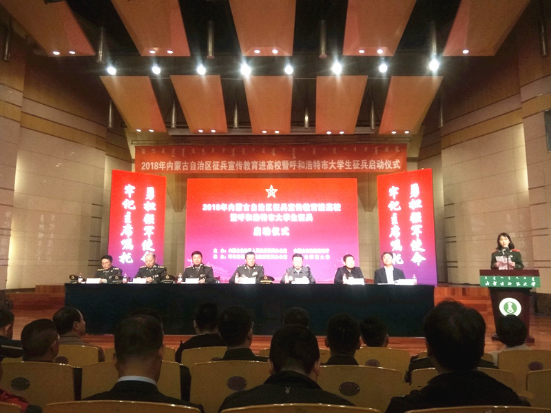 4月25日上午,“2018年內(nèi)蒙古自治區(qū)征兵宣傳教育進(jìn)高校暨呼和浩特市大學(xué)生征兵啟動(dòng)儀式”在內(nèi)蒙古師范大學(xué)舉行。內(nèi)蒙古軍區(qū)副司令員、內(nèi)蒙古自治區(qū)征兵工作領(lǐng)導(dǎo)小組副組長(zhǎng)張英奎,自治區(qū)教育廳副廳長(zhǎng)王惠忠,呼和浩特警備區(qū)政治委員孫炳文,呼和浩特市副市長(zhǎng)、呼和浩特市征兵工作領(lǐng)導(dǎo)小組組長(zhǎng)王繼平,內(nèi)蒙古軍區(qū)動(dòng)員局副局長(zhǎng)唐洪青,呼和浩特警備區(qū)副司令員、呼和浩特市征兵工作領(lǐng)導(dǎo)小組副組長(zhǎng)、呼和浩特市征兵辦公室主任孫振國(guó)出席會(huì)議,我校納麗娜副院長(zhǎng)、學(xué)生處陳青春副處長(zhǎng)、學(xué)生處資助管理中心王麗老師及學(xué)生代表參加了此次儀式。