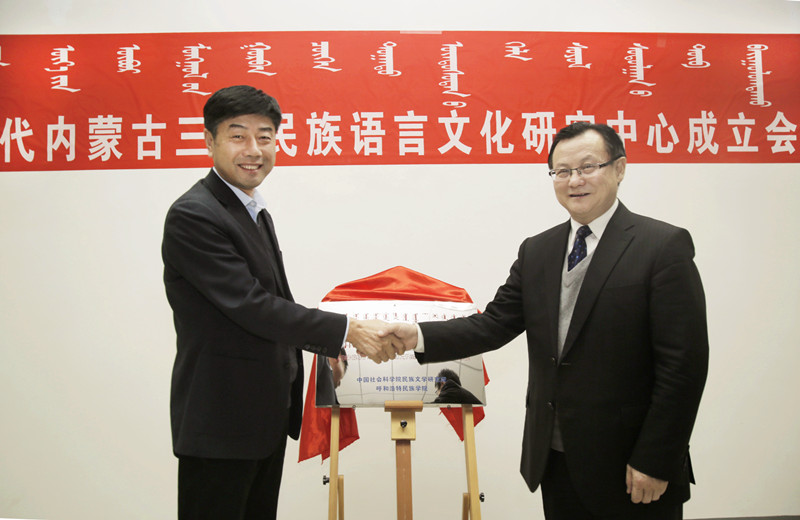 為了學習貫徹落實黨的十九大精神,服務內蒙古自治區民族文化建設,搶救保護非物質文化遺產,增強文化自信,更好地為內蒙古文化強區做貢獻,2017年12月30日上午,由中國社會科學院民族文學研究所與呼和浩特民族學院聯合共建的“新時代內蒙古三少民族語言文化研究中心”在我校綜合樓11樓會議室掛牌成立。