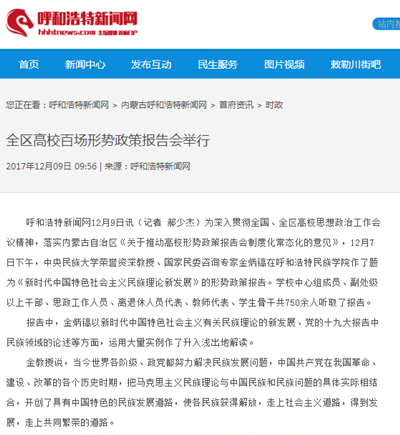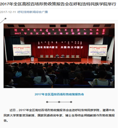 12月7日下午,中央民族大學(xué)金炳鎬教授應(yīng)邀來(lái)我校作形勢(shì)政策報(bào)告,這是我校“2017年全區(qū)高校百場(chǎng)形勢(shì)政策報(bào)告會(huì)”系列活動(dòng)之一。經(jīng)宣傳部向媒體推薦,《內(nèi)蒙古日?qǐng)?bào)》(蒙文版)、中國(guó)新聞網(wǎng)、呼和浩特新聞網(wǎng)、呼和浩特新聞綜合廣播對(duì)此次活動(dòng)進(jìn)行了報(bào)道,并有其他媒體進(jìn)行轉(zhuǎn)載報(bào)道。