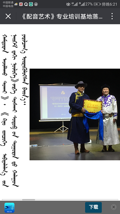 隨后,內蒙古配音藝術協會向我校傳媒系頒發了“配音藝術專業培訓基地”牌匾。據此,我校傳媒系成為全區乃至全國范圍內第一個蒙古語影視配音藝術專業培訓基地。