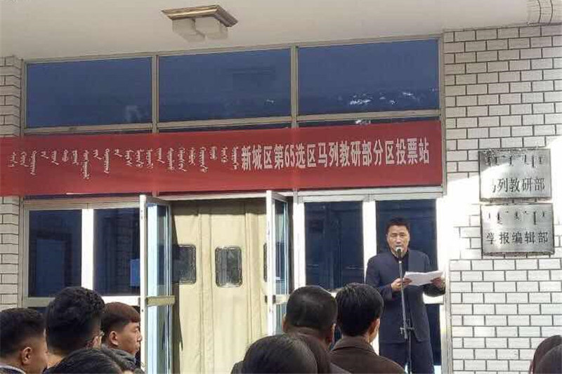 按照新城區人大選舉委員會統一部署,11月8日中午,我校舉行了新城區第十七屆人民代表大會第65選區代表選舉大會。自治區、呼和浩特市、新城區三級督查組成員到校督查指導了選舉工作。全校設主會場1個、投票點15個,共由8450名選民參加投票選舉。選區主會場設在圖書館二樓報告廳,學校黨委班子成員、機關工作人員和離退休人員參加了主會場的投票。主會場的選舉大會由第65選區選舉工作領導小組副組長、黨委辦公室主任吳阿古拉主持,各投票站的選舉工作由系部黨總支書記主持。