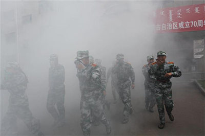 本次演練科目主要有火災(zāi)逃生、展出安全教育系列展板、消防官兵使用滅火器進行滅火、消防車水帶出水演示和防暴恐安全事件演練等五項。