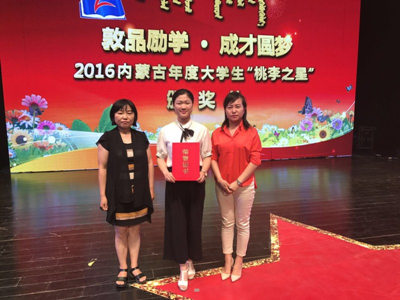 6月16日晚,“敦品勵學·成才圓夢”——2016內蒙古年度大學生“桃李之星”頒獎活動在內蒙古大學舉行,10名“桃李之星”稱號獲得者和20名提名獎獲得者受到表彰。我校外語系趙圓同學榮獲提名獎。