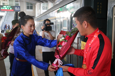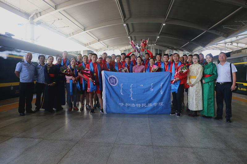 學(xué)校盛大歡迎儀式開始前,納麗娜副院長代表學(xué)校到呼和浩特東站,迎接載譽歸來的領(lǐng)隊、教練員和運動員。(體育系供稿)