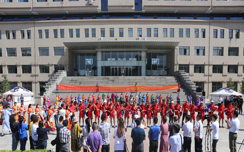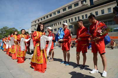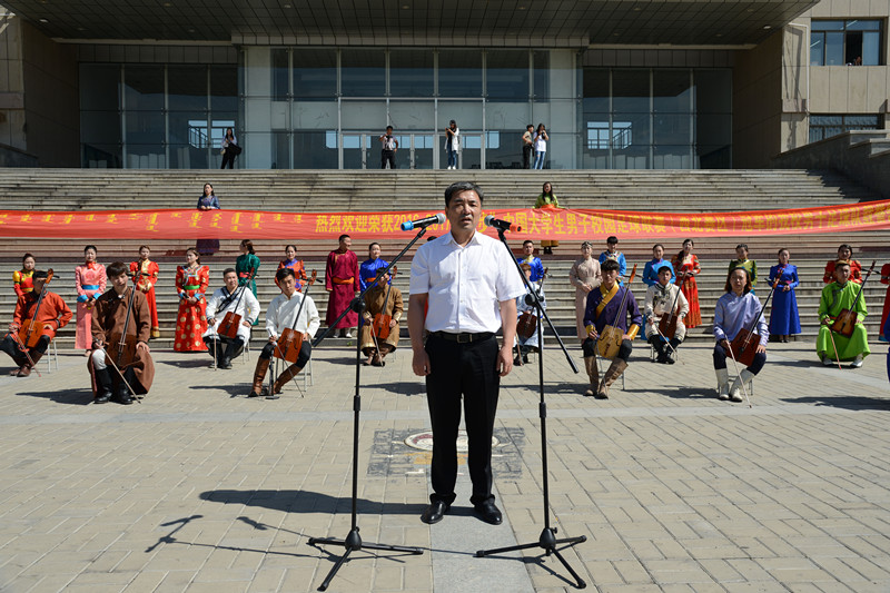 上午9時30分,我校在天驕廣場舉行了隆重?zé)崃?、儉樸簡約的歡迎儀式。由學(xué)生代表自發(fā)組織的迎接隊伍,在悠揚的馬頭琴、呼麥和長調(diào)聲中,為領(lǐng)隊、教練員、運動員敬獻了哈達、馬奶及鮮花。