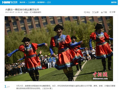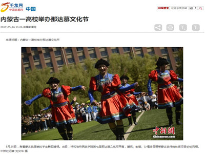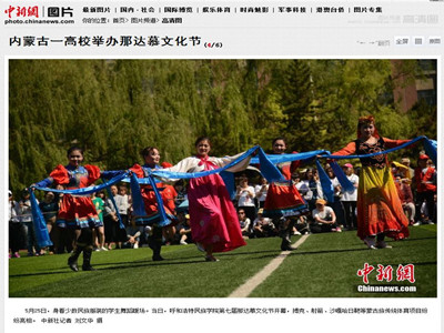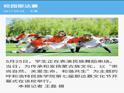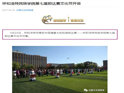 我校宣傳部邀請(qǐng)的新華社內(nèi)蒙古分社記者、中國(guó)新聞社內(nèi)蒙古分社記者、內(nèi)蒙古日?qǐng)?bào)社蒙文報(bào)記者、內(nèi)蒙古日?qǐng)?bào)社漢文報(bào)記者、內(nèi)蒙古電視臺(tái)記者、內(nèi)蒙古電視臺(tái)青年欄目組記者、北方新報(bào)記者、呼和浩特電視臺(tái)記者、呼和浩特廣播電臺(tái)記者、內(nèi)蒙古足球頻道記者等多家媒體記者到場(chǎng)拍攝、采訪,并刊發(fā)了報(bào)道。內(nèi)蒙古日?qǐng)?bào)(漢)、內(nèi)蒙古日?qǐng)?bào)(蒙)等傳統(tǒng)媒體對(duì)本次那達(dá)慕文化節(jié)開幕式上呈現(xiàn)的特色入場(chǎng)式、祭火儀式、民族文化藝術(shù)表演、那達(dá)慕傳統(tǒng)體育比賽、蒙古族服飾展示以及國(guó)畫展等內(nèi)容進(jìn)行了專門刊登。其中,內(nèi)蒙古電視臺(tái)青年欄目組進(jìn)行了全程追蹤報(bào)道。隨后,中新網(wǎng)、中國(guó)首都網(wǎng)、東方體育網(wǎng)、新華網(wǎng)、海外網(wǎng)(人民日?qǐng)?bào)海外版官網(wǎng))、內(nèi)蒙古新聞網(wǎng)、正北方網(wǎng)、青海新聞網(wǎng)等主流媒體通過(guò)官方網(wǎng)站、微信公眾平臺(tái)、手機(jī)客戶端等方式,對(duì)我校那達(dá)慕文化節(jié)進(jìn)行了宣傳推送和轉(zhuǎn)載報(bào)道。
