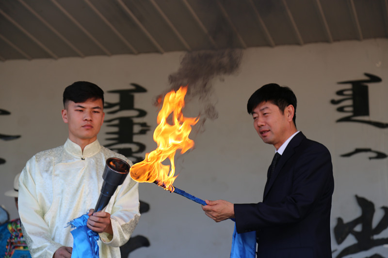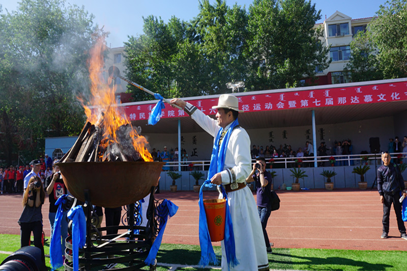 接著,舉行火炬接力與祭火儀式。由孫國權(quán)書記點(diǎn)燃火炬,各系火炬手接力傳遞,隨后點(diǎn)燃圣火盆,并由格日樂圖院長(zhǎng)祭旺圣火。