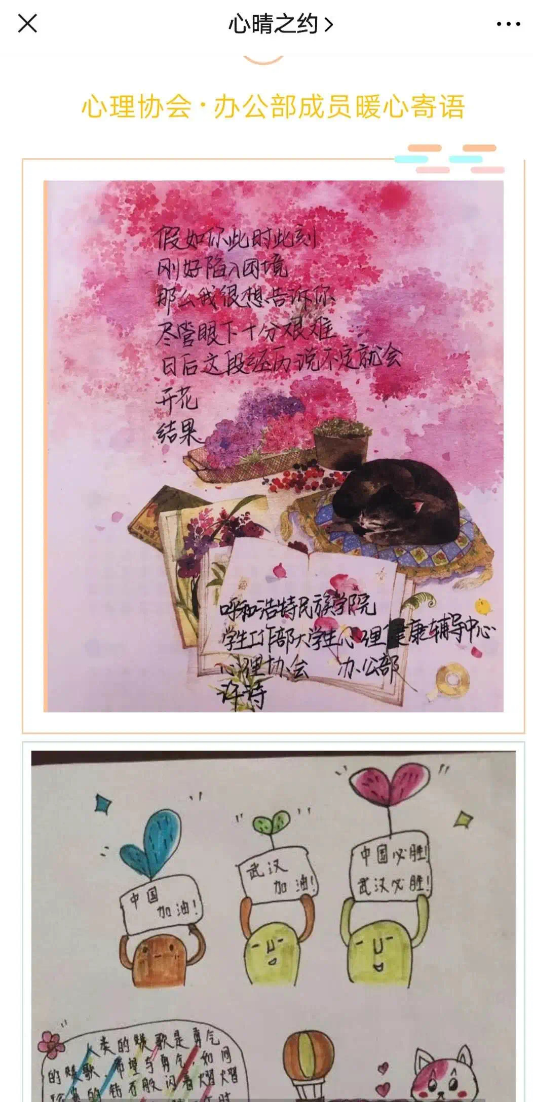 我校學生工作部師生面對疫情,采取行動積極應對,自3月23日起,通過線上方式開展了“3.25心理健康宣傳周----山川異域,風月同天。健康心理,共克時艱”的主題活動。活動分為三個部分:“心理協會風采展”、“晚安計劃”和“心靈樹洞”。
