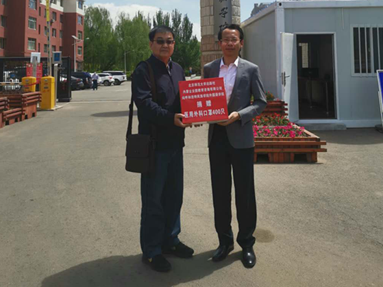 疫情無情人有情,眾志成城抗疫情。在畢業生即將返校的關鍵時刻,5月19日上午學校西門前,呼和浩特市青年企業家協會副秘書長、北京師范大學出版社內蒙古辦事處主任、內蒙古云圖教育咨詢有限公司總經理張興、副總經理周紅梅、營銷助理韓璐一行三人代表北京師范大學出版社、內蒙古云圖教育咨詢有限公司向外國語學院捐贈醫用外科口罩400只。外國語學院黨總支書記布日古德、院長肖查娜、副書記紅梅、副院長陳玉紅、教學科研辦公室主任胡日查畢力格出席捐贈儀式。