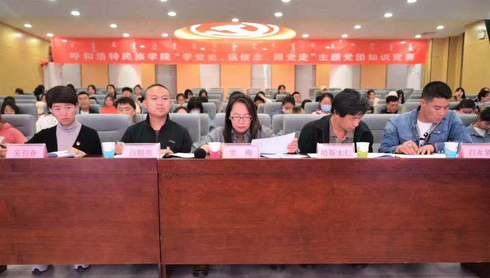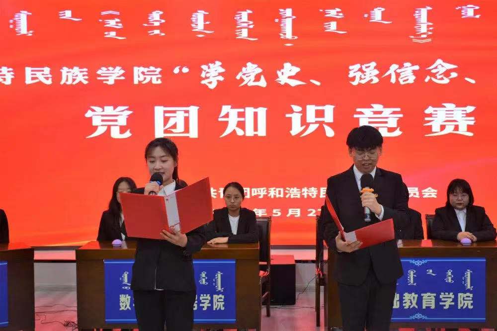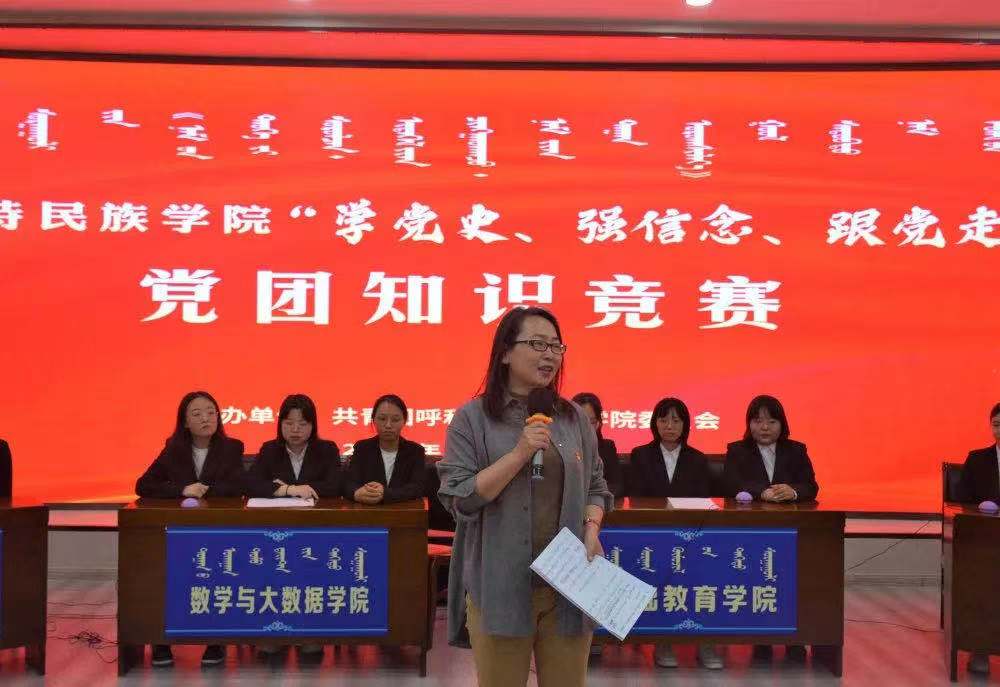 為深入開展黨史學(xué)習(xí)教育,引導(dǎo)廣大青年學(xué)史明理、學(xué)史增信、學(xué)史崇德、學(xué)史力行,于5月27日晚,校團委在圖書館一樓報告廳舉辦了“學(xué)黨史、強信念、跟黨走”主題黨團知識競賽決賽。大賽邀請到計算機學(xué)院黨總支書記雪梅、學(xué)生工作部副部長白永泉、馬克思主義學(xué)院哈斯木仁教授、美術(shù)學(xué)院黨總支副書記吳利春、團委副書記白銀亮擔(dān)任評委。