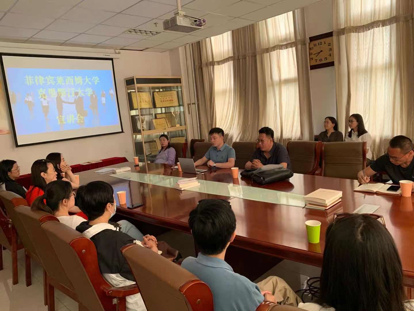6月11日,菲律賓萊西姆大學(xué)、克里斯汀大學(xué)國(guó)際學(xué)院招生部主任陳兵兵、國(guó)內(nèi)西部招生部主任王志強(qiáng)一行2人來(lái)我校在圖書館四樓會(huì)議室舉行宣講會(huì)。我校對(duì)外合作與交流中心負(fù)責(zé)人及有意向赴菲律賓攻讀碩士、博士研究生學(xué)歷學(xué)位的20余名教師參加了宣講會(huì)。
