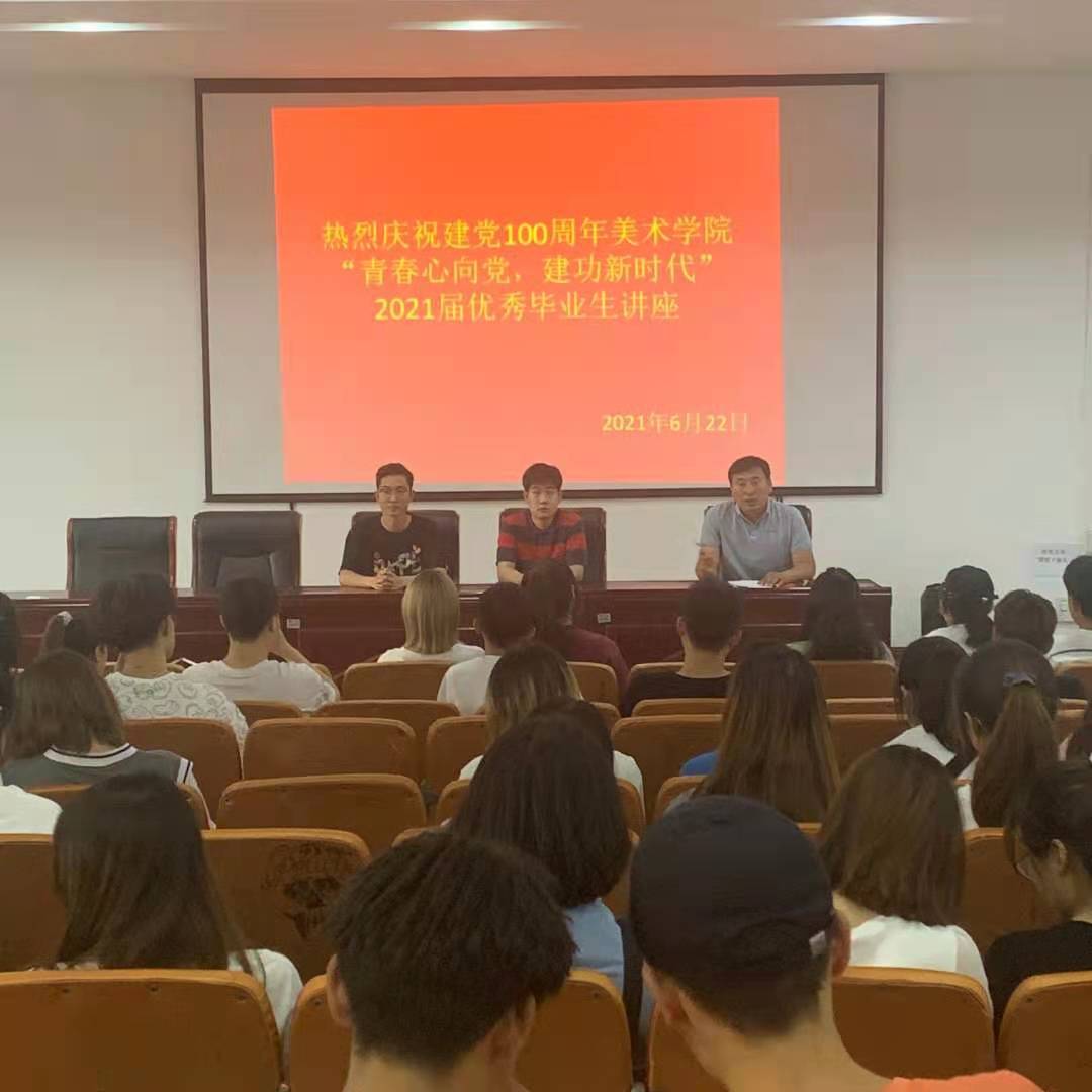 為進一步增強學生黨員黨性觀念,促進學生黨員牢固樹立“四個意識”,堅定“四個自信”,積極發(fā)揮優(yōu)秀黨員畢業(yè)生的模范帶頭作用,在全體學生黨員、學生干部中深入推進黨史學習教育,6月22日晚,美術(shù)學院在美術(shù)樓四樓階梯教室舉辦了慶祝建黨100周年“青春心向黨,建功新時代”優(yōu)秀黨員畢業(yè)生專題教育講座。本次講座由學生二支部書記常志君主持,邀請了2017級版畫2班的宋睿雄同學和2017級中國畫2班的胡錦浩同學擔任主講,美術(shù)學院全體學生黨員、重點培養(yǎng)對象、入黨積極分子和學生干部100多人參會。
