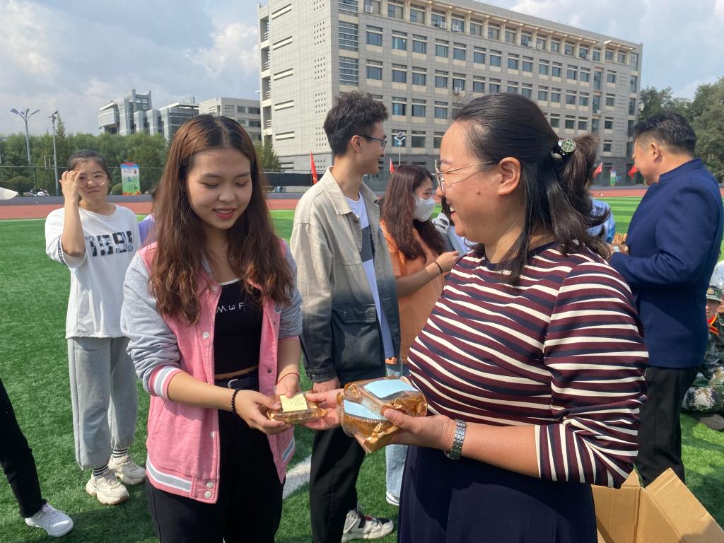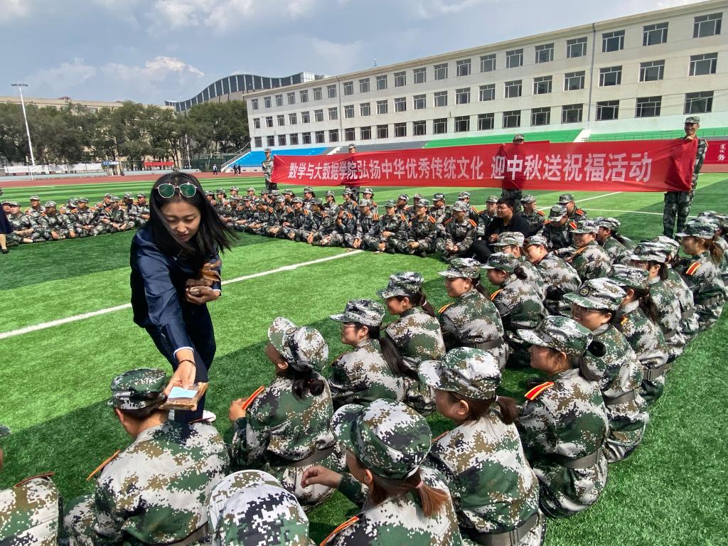 “每逢佳節(jié)倍思親”在中秋佳節(jié)來臨之際,為了讓軍訓中的莘莘學子在祥和愉悅的氛圍中歡度中秋,感受到家的溫暖,數(shù)學與大數(shù)據(jù)學院于9月20日中午在操場上特意舉辦了以“弘揚傳統(tǒng)文化”為主題的迎中秋送祝福活動,將200余個月餅送到2021級新同學的手中,將學院的祝福和問候送給了每一位新生。參加本次活動的有數(shù)學與大數(shù)據(jù)學院院長王海清、黨總支副書記郝喜鳳、新生班主任代表金國海老師、輔導員金玲及180名2021級入學新生、黨員代表、老生代表。