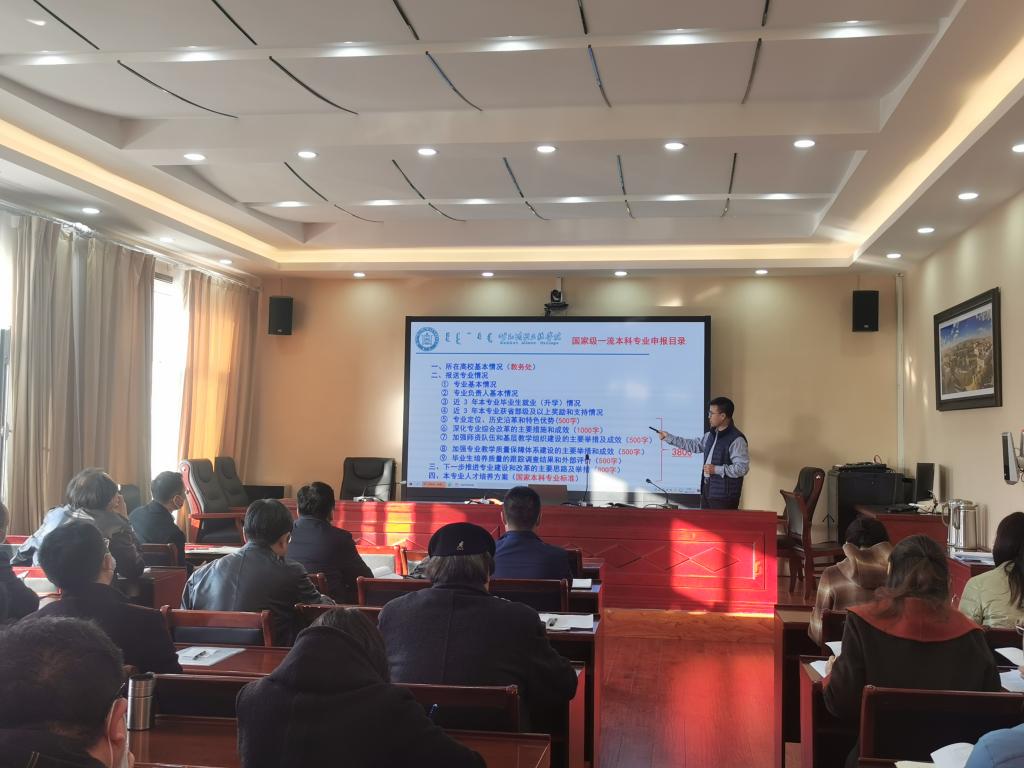 為助力一流本科專業(yè)建設(shè)點(diǎn)申報(bào)工作,強(qiáng)化專業(yè)內(nèi)涵建設(shè),提升專業(yè)建設(shè)質(zhì)量,11月4日上午,學(xué)校在辦公樓四樓召開2021年度一流本科專業(yè)建設(shè)申報(bào)培訓(xùn)會(huì)。我校各二級(jí)學(xué)院院長、分管教學(xué)工作院長、部分專業(yè)負(fù)責(zé)人、教務(wù)處工作人員等共計(jì)40余人參加會(huì)議。教務(wù)處處長額爾敦布和主持培訓(xùn)會(huì)。