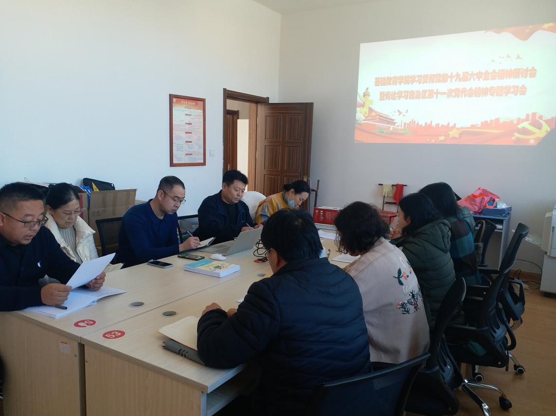 為認真學習貫徹黨的十九屆六中全會精神和自治區第十一次黨代會精神,做好學習宣傳、研究闡釋工作,持續推進黨史學習教育走深走實,引導廣大師生匯聚起堅定歷史自信、創造歷史偉業的磅礴力量,2021年12月6日下午,基礎教育學院黨總支在崇正樓402室組織召開了黨的十九屆六中全會精神學習研討會暨傳達學習自治區第十一黨代會精神專題學習會。會議由黨總支書記常喜主持,全體教職工參與學習研討。
