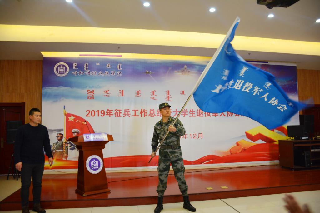 武裝部副部長白永泉為呼和浩特民族學院大學生退役軍人協會授會旗