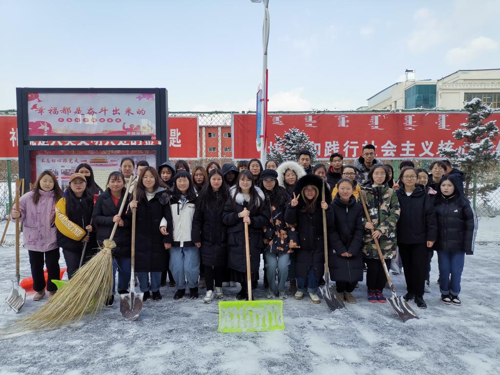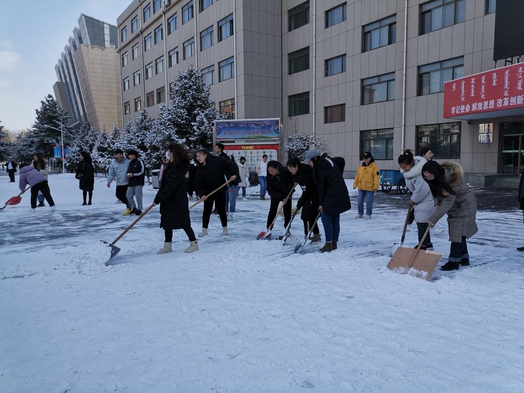 近日,呼市再次迎來降雪,校園內白雪皚皚、銀裝素裹,為校園內帶來一絲詩意,因此校園內處處被雪覆蓋,有的地方結成薄冰,給老師、同學們及來往的行人們的出行帶來了不便。為引導青年學子尋初心、擔使命,培養學生服務他人意識,12月16日中午,外國語學院學生黨員、全體學生會成員和青年志愿者協會共計65人在雷旭平老師的帶領下于都林樓北門開展了“不忘初心、牢記使命”暖心冬日除雪活動。