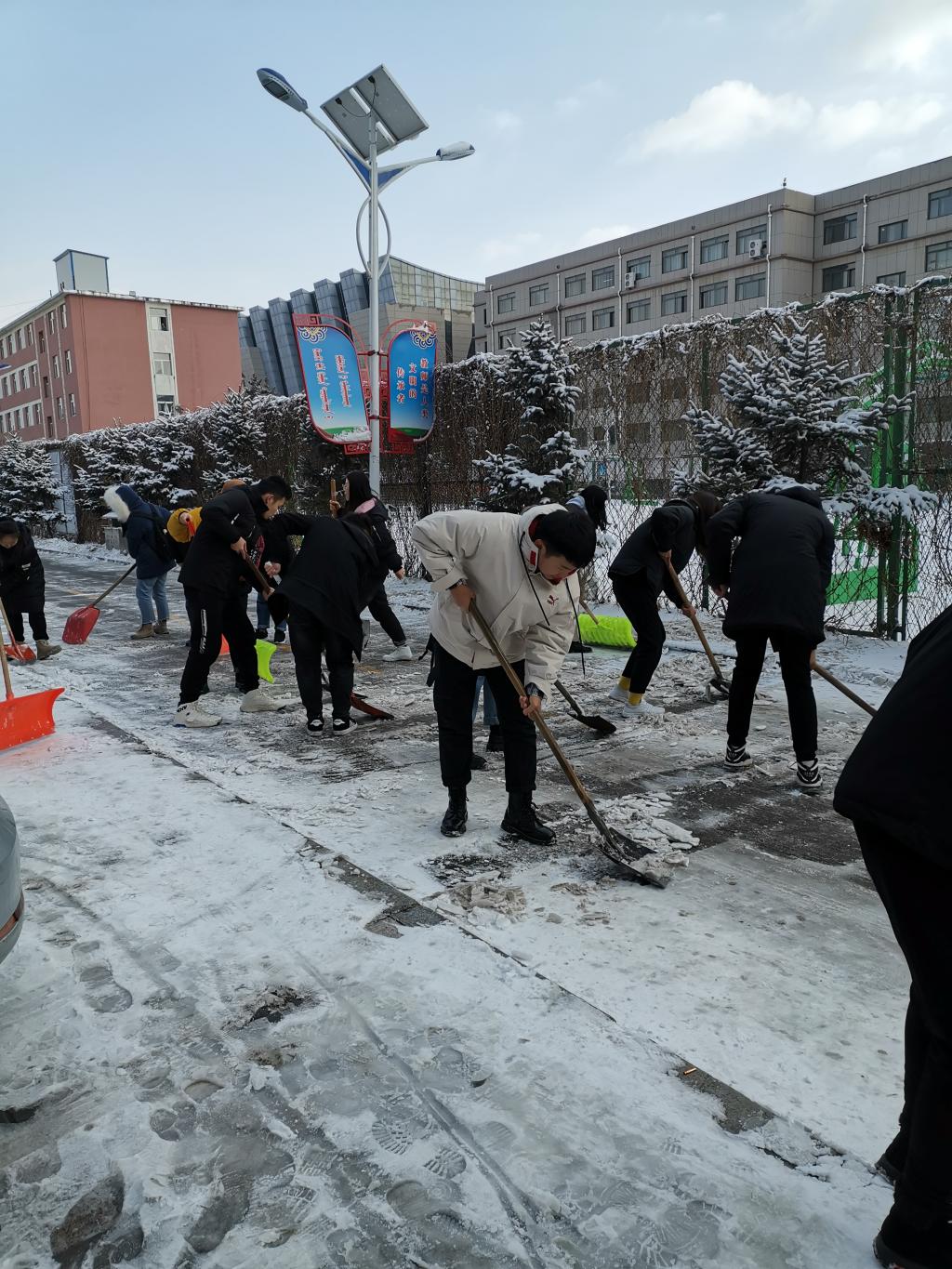 在活動中,同學們手持鐵鍬、掃帚等工具,以小組為單位分工協作,積極配合除雪工作,為清理出一條條安全的通道,同學們不顧天氣嚴寒,盡管雙手被凍的通紅,也絲毫沒有阻擋同學們積極除雪的熱情,同學們勞動的身影成為校園內一道亮麗的風景線。在除雪過程中,同學們有的鏟、有的掃,干勁十足,經過兩個多小時的努力,終于將道路打掃干凈。