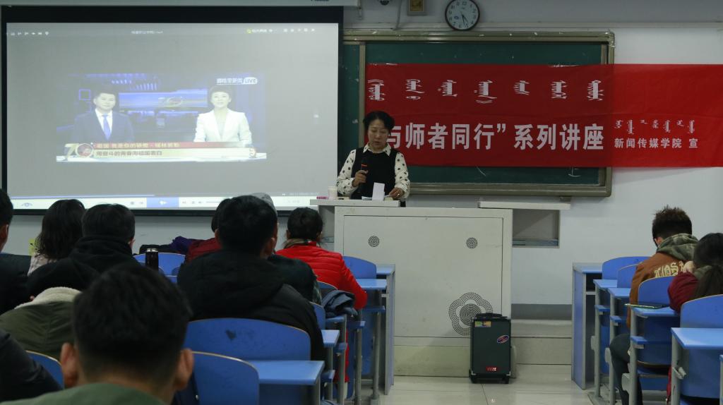 包金花老師在內蒙古電視臺從事新聞制作工作已有33年,她在專業領域有著豐富的工作經驗和獨到的專業見解。她以今年為迎接新中國成立70周年,內蒙古電視臺新聞中心策劃的與22個旗縣電視臺合作進行的首次大型的大型融媒體新聞直播活動“祖國,我是你的驕傲”這個成功案例為此次講座的切入點,講述了這個成功案例的精彩臺前幕后故事,啟發在場師生的思考。