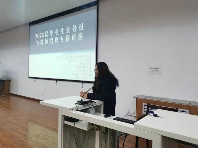 為推進(jìn)高質(zhì)量就業(yè),提高畢業(yè)生公考、教師招考過關(guān)成功率,12月2日至4日晚,由學(xué)校就業(yè)指導(dǎo)處主辦,美術(shù)學(xué)院聯(lián)合文學(xué)院、數(shù)學(xué)與大數(shù)據(jù)學(xué)院、公共管理學(xué)院、經(jīng)濟(jì)管理學(xué)院、體育學(xué)院、法學(xué)院、馬克思主義學(xué)院共同承辦的公務(wù)員及教師招考前輔導(dǎo)專題講座在美術(shù)樓四樓階梯教室舉行。三天3場講座中,共有2020屆畢業(yè)生近600人參加,本次講座邀請了資深講師石小卉老師主講。