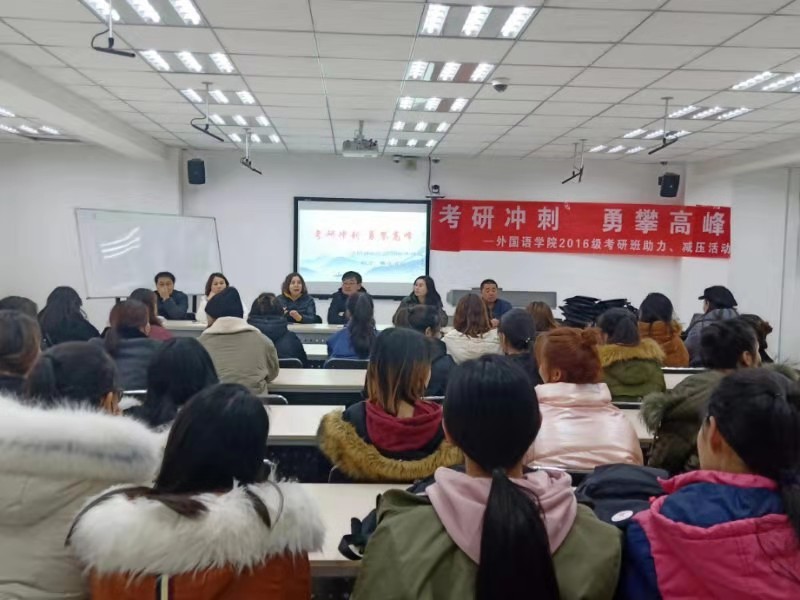 考研沖刺,勇攀高峰。為舒緩考研學(xué)子備考壓力,幫助我院考研學(xué)生以坦然的心態(tài)和堅定的信心迎接考試,11月29日下午,外國語學(xué)院在都林樓626室組織開展了2016級考研學(xué)生助力、減壓活動。學(xué)院黨總支書記布日古德、院長肖查娜、黨總支副書記紅梅和2016級班主任代表、任課教師代表參與本次活動,為即將考研的45名同學(xué)送上了鼓勵和祝福。