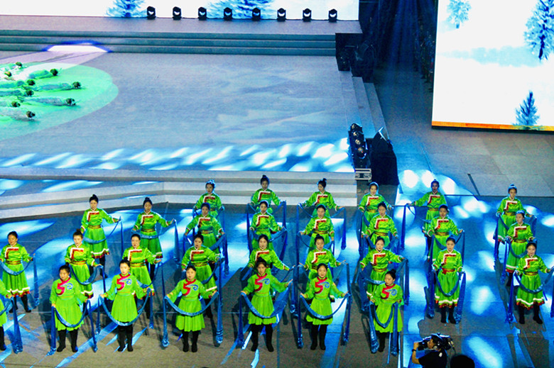 我校志愿者們與呼和浩特藝術學校的演員們共同合作,擔任開場與結尾等節目的演出服務工作。節目中,身著綠色和藍色服飾的青年們象征著草原和藍天,手捧著藍色哈達,展現出草原人民的熱情好客。青春洋溢的志愿者們,用她們活力熱情的表演為此次活動增添了一抹亮麗的風景。