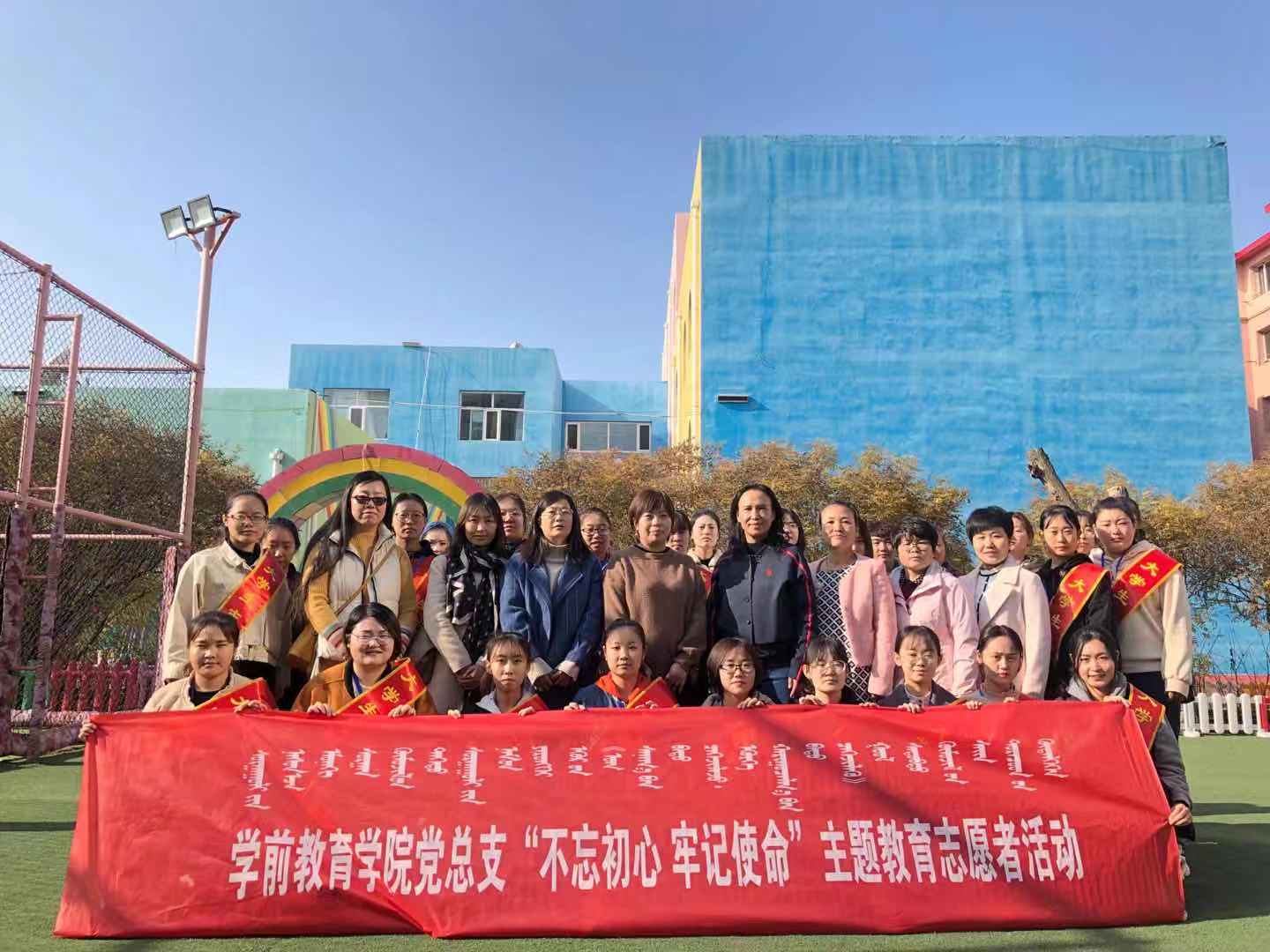 在“不忘初心、牢記使命”主題教育開展之際,11月8日上午10時學前教育學院黨總支書記娜仁其木格帶領教師黨員和學生到新城區第一幼兒園開展志愿者服務活動。