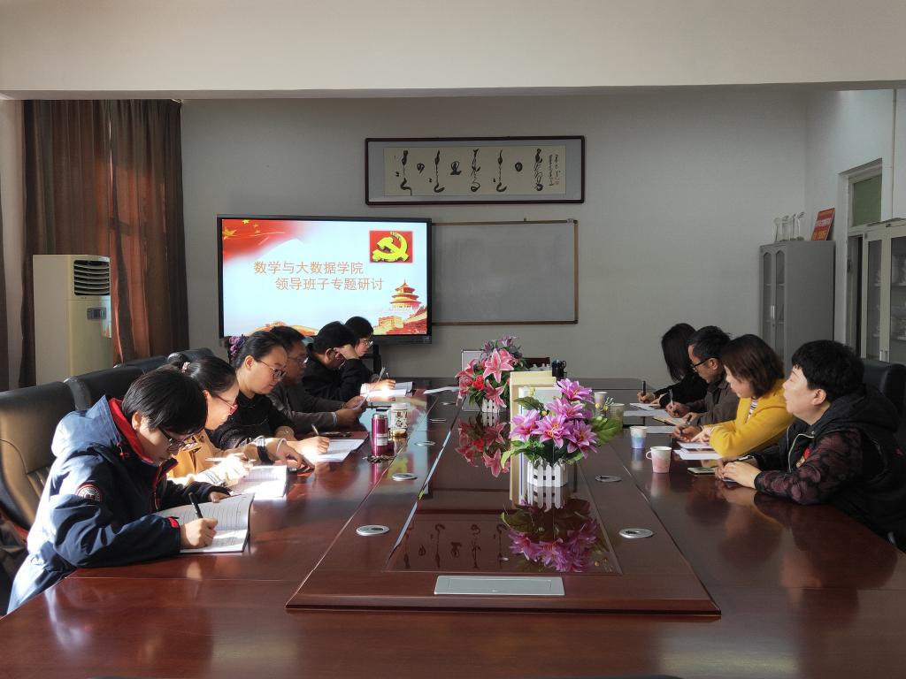 10月24日上午,數學與大數據學院在沃德樓205會議室(主題教育讀書室)召開班子成員對照黨章黨規找差距專題會議,學校主題教育第三指導組海泉組長一行到會指導。學院領導班子成員在前期逐條認真學習的基礎上,對照黨章、《關于新形勢下黨內政治生活的若干準則》《中國共產黨紀律處分條例》查擺問題,并結合個人、職責、工作實際談學習認識、談短板不足、談問題原因、談整改舉措。