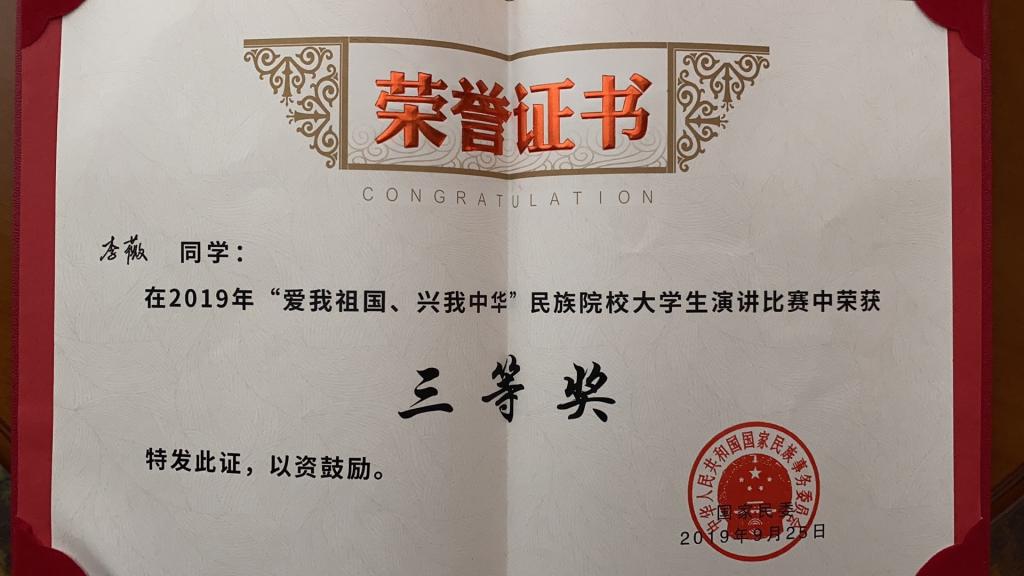 此次比賽共有19名來(lái)自各民族院校的選手參賽,校團(tuán)委通過(guò)筆試、面試、演講層層選拔,最終選出廣播站李薇同學(xué)代表學(xué)校參加了比賽。在比賽中,她用飽滿的熱情、生動(dòng)的語(yǔ)言、鮮活的事例講出了自己身邊的民族團(tuán)結(jié)故事,抒發(fā)了對(duì)于民族團(tuán)結(jié)與愛國(guó)主義情懷的理解,展現(xiàn)出了我校大學(xué)生的青春朝氣和良好的精神風(fēng)貌。