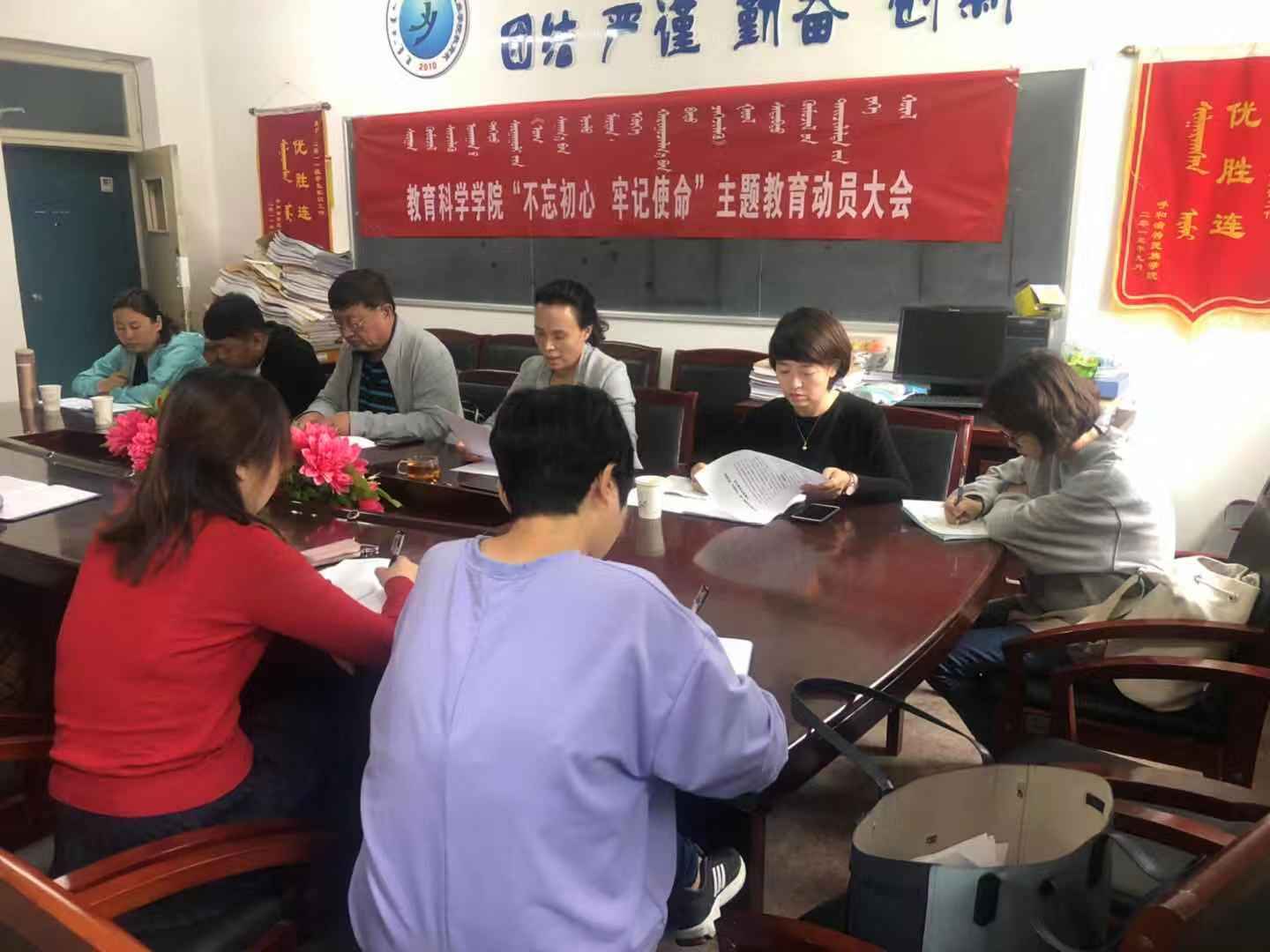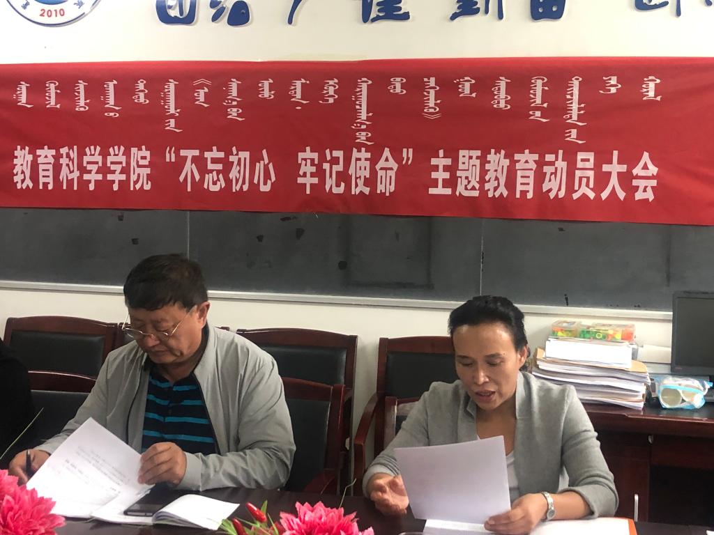 首先,在動員部署會議上,黨總支副書記娜仁其木格代表學(xué)院傳達(dá)了學(xué)校“不忘初心、牢記使命”主題教育動員會會議精神。