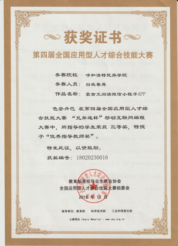 比賽現場,各參賽隊通過ppt演示、現場操作、答辯等環節展示了創新項目。經過兩天的比拼,最終評選出一等獎6個、二等獎24個、三等獎28個。我校選手充分發揮學校特色和專業優勢,用出色的技術、完整的演示和詳細的回答贏得評委的青睞,最終《蒙古文閱讀微信小程序APP》項目脫穎而出獲得大賽三等獎。