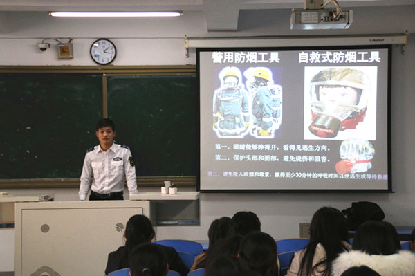 曹教官?gòu)母咝;馂?zāi)案例講起,結(jié)合校園消防安全管理、基本消防常識(shí)和危急時(shí)刻逃生方案,闡述了開展消防安全教育的重要性,指出了目前高校消防安全存在的主要隱患,強(qiáng)調(diào)了在火災(zāi)發(fā)生后必須掌握的逃生方式。在火災(zāi)案例講解過程中,曹老師重點(diǎn)強(qiáng)調(diào)了對(duì)于寢室私拉電線、違規(guī)大功率用電等常見的不良生活習(xí)慣帶來的危險(xiǎn)性,并呼吁學(xué)生堅(jiān)決禁止床上用電腦、宿舍吸煙等惡習(xí)。曹老師還指出,作為高校學(xué)生要主動(dòng)學(xué)習(xí)消防安全知識(shí),掌握必要逃生技能。